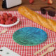 Green and blue gradient, going from blue to green. Canvas effect added.