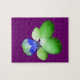 This awesome puzzle features a photograph of a wild Pansy flower. The photo has been artificially coloured resulting in a pansy with glowing green petals and a bright blue centre. The background is purple to complement the colours of the flower.