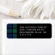 Christmas holiday return address labels feature white modern custom text that can be personalised with your name and address in white on a black background. A festive classic navy blue and hunter green Scottish tartan black watch plaid pattern accents the border.