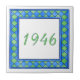 A hand drawn blue and green chequered frame around a green house number on a white background with dark blue outlines.