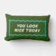 Simple and fun, this dual sided green and aqua blue pink lumbar pillow features a wavy rectangle and two different but coordinating sides with friendly text reminders of "you look nice today" and "you are kind and smart" to spread positivity in your life and your home. You can change the text for your own custom message too!