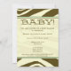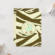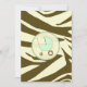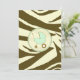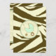 An invitation featuring a brown zebra print background over warm beige with light green trim. Personalise the brown text with details of your event. Opposite side is solid zebra print with a green baby carriage inside a matching circle shaped frame.