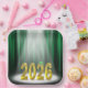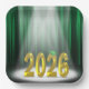 Gold 2026 text in the spotlight on stage with a green curtain background for a graduation party