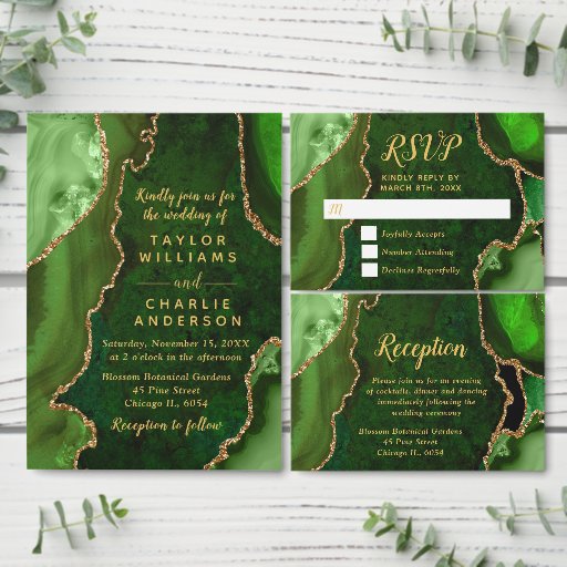 Create a striking presentation with this green and gold agate marble menu, perfect for wedding receptions and versatile enough for stylish multi-purpose use. Deep emerald tones, organic stone-inspired textures, and shimmering gold accents come together to create a refined yet dramatic look that pairs beautifully with fall or winter celebrations. Designed to complement elegant, modern, and glamorous events, this agate-inspired menu can be customized for wedding dinners, cocktail hours, dessert tables, or upscale event and restaurant menus, offering timeless sophistication that extends well beyond the wedding day.