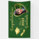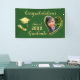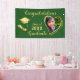 Create a unique green and gold graduation banner for the class of 2025 graduate with a heart-shaped photo, Congratulations saying, and grad's cap and diploma illustrations. Please personalise with the graduate's name and surname, upload a custom photo via template, and change a year before ordering. You can also change the background colour inside the design tool to match your school colours.