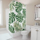 Tropical leaves and monogram green, gold shower curtain. It features leaves of Split Leaf Philodendron (Monstera deliciosa) or Swiss Cheese Plant and palm leaves in green with gold outline .