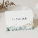 This green and gold mountain thank you card is perfect for your elegant boho mountain forest wedding. With a rustic emerald green watercolor landscape dotted with trees, birds, and highlights of gold foil. It's just what you're looking for to complete your unique modern destination wedding.
