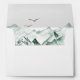 This green and gold mountain wedding invitation envelope is perfect for your elegant boho mountain forest wedding. With a rustic emerald green watercolor landscape dotted with trees, birds, and highlights of gold foil. It's just what you're looking for to complete your unique modern destination wedding.