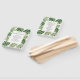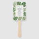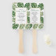 Green and gold tropical leaves wedding program hand fan. It features leaves of Split Leaf Philodendron (Monstera deliciosa) or Swiss Cheese Plant and palm leaves in green with gold outline . Your wording is in a white frame with gold outline.