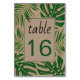Green and gols tropical leaves wedding table numbers card. This tropical design features leaves of Split Leaf Philodendron (Monstera deliciosa) or Swiss Cheese Plant and palm leaves in green with gold outline on kraft look paper. Put your text is in the tan frame with gold outline.
