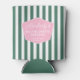 Customise your cabana-theme bachelorette party with our stylish can cooler featuring mid-century modern styling and a green and white stripe background.