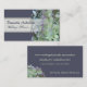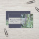 Green hydrangea and purple business card template. Green flowers bloom at the side of this medium size elegant, floral card with a dark purple background and matching text on the front. A white "ribbon" holds lines for name and title on the front, with 4 more lines of text to customise on reverse. You may upgrade the paper type in the box to the right.