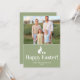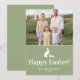 Destei's sage green Easter card template featuring a bunny silhouette and two Easter eggs in white color. The top half is a photo template for a custom family photo and the bottom displays a “Happy Easter!” message with space for a family name and year. Perfect for creating a cute, personalized Easter greeting. The other side of the card is green.