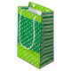 A whimsical design that can be used for any occasion, even St. Patrick's Day. The from and back pattern are dark green with a white dot pattern. The top and bottom band is a yellow-green with white dots. Both side panels the bag are made up of green and white stripes.