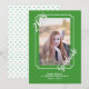 Stylish graduation announcement done in grass green with a white line frame around the photo area. Personalise the picture with your grad's photo. The white text is all custom and ready to personalise to read what you want. The back has a green on white polka dot pattern. Model place holder photo courtesy of Lorri Lang.