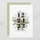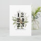 This save the date card features a watercolor Christmas bouquet made from forest foliage set on a bright white background. In the centre are extra large black numbers representing your upcoming wedding date. The back is a coordinating solid green background.