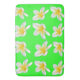 Pictured on lime green are yellow Frangipani flowers in a pattern