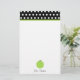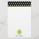 Stationery for teachers featuring a border of black with white polka dots and green trim at top. Illustration of a green apple at bottom. Personalise with your name under apple. Look for matching items at Jill's Paperie.