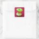 Photo of a big green apple against red background. The apple is eaten out, only the core is left.