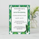 Fun party invitation perfect for birthday or retirement party features a green and white argyle background pattern. On one side is a white rectangle with green trim with customisable celtic style font in dark grey and green. In the bottom right hand corner is a dark green silhouette of a golfer swinging a golf club. On the other side is the same white rectangle with green trim. Inside this rectangle are four silhouettes of the golfer swinging his club side by side and overlapping. Each golfer is a different shade of green. Whether this invitation is for a birthday party or a retirement party, the guest of honour will love this cool golf design.