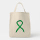 The tote bag features green awareness ribbon art. The green awareness ribbon colour means support for adrenal cancer, celiac disease, bipolar disorder, environmental protection, bone marrow donation, kidney disease, cerebral palsy, literacy, arthritis (USA), tissue donation, organ transplant, stem cell transplant, spinal cord injury, depression, mental health, Traumatic Brain Injuries (TBI), mitochondrial disease, Clostridium difficile (C.diff.) and missing children to name a few. Kelly Green Ribbon is for Gallbladder/Bile Duct Cancer.