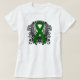 Green ribbon with wings and filigree pattern. The green ribbon is associated Glaucoma Awareness in January. Bipolar Disorder Awareness Ribbon in February. Kidney Disease Awareness, Kidney Donation Awareness, and Mental Retardation Awareness in March. Environment Awareness, Living Organ Donation Awareness, Organ Donation Awareness, Organ Transplant Awareness, and Tissue Donation Awareness in April. Cerebral Palsy Awareness, Childhood Depression Awareness, Mental Health / Mental Illness Awareness, Missing Children Awareness, Neurofibromatosis Awareness, Spinal Cord Injury Research, Tourette's Syndrome Awareness in May. Tourette's Syndrome Awareness in June as well. Mitochondrial Disease Awareness in September. Depression Awareness, Manic Depression Awareness, and Literacy Awareness in October. Bone Marrow Donation Awareness in November. Eye Injury Prevention Awareness, Fanconi's Syndrome Awareness, Fibrodysplasia Ossificans Progressiva, Freedom Awareness, Growth and Rebuilding Awareness, Kidney Cancer, Nephrotic Syndrome Awareness, Neural Tube Defects Awareness, Primary Sclerosing Cholangitis, Safe Driving Awareness, Save Darafur Awareness, Stem Cell Donor Awareness, Stem Cell Research Awareness, Traumatic Brain Injury Awareness, Von Hippel Lindau Awareness, Worker Safety Awareness.