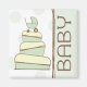 A magnet featuring an illustration of a baby shower cake with a green, brown, and cream colour scheme with matching green baby carriage on top. Right side is green with brown trim. Brown text reads "BABY." Background is sheer green polka dots. Great for a baby shower favour. Look for matching invitations and postage in the "Baby" category of Jill's Paperie.