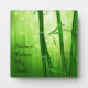 Text which says - silence calms my soul. With a lush emerald green image of bamboo stalks with long delicate leaves and pale bokeh lights in the background.
