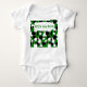 This baby bodysuit has a Bauhaus design of triangles, circles, rectangles, and pentagons in black and white on a field of green.