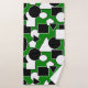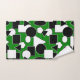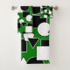 This towel set has a Bauhaus design of triangles, circles, rectangles, and pentagons in black and white on a field of green.