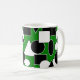 This mug has a Bauhaus design of triangles, circles, rectangles, and pentagons in black and white on a field of green.