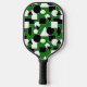 This pickleball paddle has a Bauhaus design of triangles, circles, rectangles, and pentagons in black and white on a field of green.