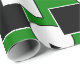 This wrapping paper has a Bauhaus design of triangles, circles, rectangles, and pentagons in black and white on a field of green.
