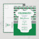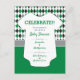 Oversized elegant argyle pattern in school colours of green and black set the backdrop for this cute baby shower design. A white baby bodysuit has all the text written on it for the big event, which can be a couples shower or just for mum. Design comes in maroon and grey, burnt orange and grey, red and black, green and black, orange and navy, green and yellow, and purple and grey. Matching products available.