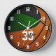 This personalised basketball wall clock features the realistic image of a basketball that has two recolored panels--one green and one black--with overlying clock face numerals - personalise with player name in an "autograph" style font overlying the athlete's jersey number - by katz_d_zynes