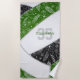 This boho style volleyball themed beach towel for her features the realistic image of an abstractly oversized volleyball that has green, black and white panels - a continuous doodle pattern of paisleys, flowers and feathers in white covers the volleyball's green and black panels - personalise with the athlete's name and monogram, varsity letter or jersey number - by katz_d_zynes