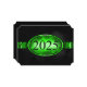 Floral designs surrounding button on top of a green ribbon that has floral designs. Black cloudy background. The back of the card has a black background with green lettering for the graduation party invitations.