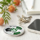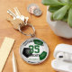 This soccer themed keychain for girls or boys features the image of a soccer ball that has green, black and white panels, upon which you can easily customise the athlete's name & jersey number plus school name & mascot name in coordinating colours - by katz_d_zynes