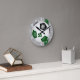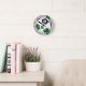 This sporty team colours soccer themed clock features the realistic image of a soccer ball upon which you can customise the athlete's name, monogram and jersey number - some of the soccer ball's typically black panels have been recolored green - the background is customisable light grey with overlying goal net accent graphic, vertical green varsity stripes and white clock face numerals - by katz_d_zynes