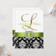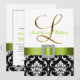 Sophisticated elegance is conveyed by this beautiful wedding invitation design. A black and white floral damask pattern serves as a background for a photo effect of the Metallic Gold Initial "L" and a lime green satin ribbon and diamond brooch ALL PRINTED on FLAT CARD Wedding Invitations. A perfect way to invite your guests to your wedding. Contemporary, yet classic damask pattern with a design which allows you to personalise the front with your names and the back is free to add your customised wedding invitation text. Wedding Invitation is set for monogram initial "L". For other letters and colours please contact designer at luxuryweddinginvitations@gmail.com. Layout Design by Elke Clarke©. Graphics licensed. Also, choose from a variety of fonts and beautiful papers to make your wedding invitations PERFECT!