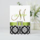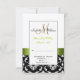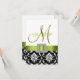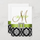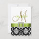 Sophisticated elegance is conveyed by this beautiful wedding invitation RSVP Card design. A black and white floral damask pattern serves as a background for a photo effect of the Metallic Gold Initial M and a lime green satin ribbon and diamond brooch ALL PRINTED on A FLAT CARD. A perfect way to have your guests respond to your wedding invitation. Comes with a blank white envelope. Contemporary, yet classic damask pattern with a design which allows you to personalise the front with your names or the type of card and the back is free to add your customised wedding RSVP text. Wedding Response Card is set for monogram initial "M". For other letters or colours of ribbon or damask, please contact designer at luxuryweddinginvitations@gmail.com. Layout Design by Elke Clarke©. Graphics licensed. Also, choose from a variety of fonts and beautiful papers to make your wedding invitations PERFECT!