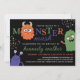 Monster mash Halloween birthday party invitation for a boy's birthday with fun monsters in orange, green, and blue throwing confetti in the air. Monster Halloween birthday party invitation in a cute monster design.