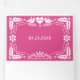 Three colour green, blue and hot pink papel picado love birds tri-fold wedding fiesta invitation. This nature inspired Mexican folk art style floral pink background.