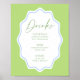 The sign features a fresh summer green background, offering a fresh and inviting canvas that exudes the warmth and vibrance of a blooming garden. Encircling your bridal shower details is a delicate sky blue scalloped frame, adding a touch of whimsy and elegance. This unique design element creates a delightful addition to the green backdrop, infusing the sign with a sense of playful sophistication.