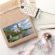 Rectangular photo sticker of a small green boat and a wooden cabin with some tall trees at the edge of the water in a fjord landscape in Byglandsfjord, Norway.