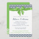 Navy blue and white zigzag or chevron pattern and a big green bow, printed design baby shower invitation.