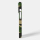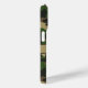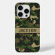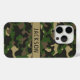 Customise this multi-hued green and brown camouflage iPhone 15 pro case with your your name in a trendy modern CAP font in brown on khaki. It's masculine and perfect for your favourite military, hunting, country or outdoorsman!
