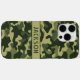 Customise this multi-hued green camouflage iPhone 16 pro max case with your name in a trendy modern CAP font in dark green on light green. It's masculine and perfect for your favourite military, hunting, country or outdoorsman!
