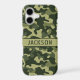 Customize this multi-hued green camouflage iPhone 17 case with your name in a trendy modern CAP font in dark green on light green. It's masculine and perfect for your favorite military, hunting, country or outdoorsman!