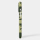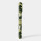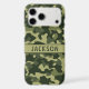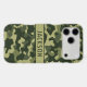 Customize this multi-hued green camouflage iPhone 17 pro max case with your name in a trendy modern CAP font in dark green on light green. It's masculine and perfect for your favorite military, hunting, country or outdoorsman!